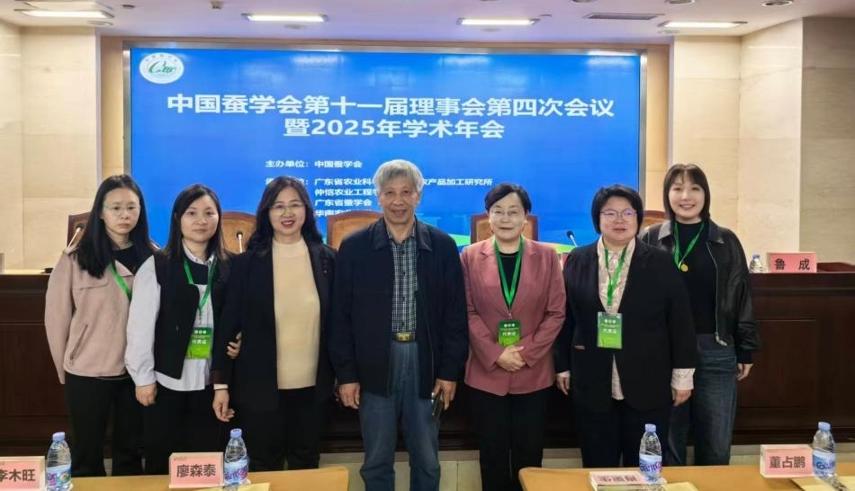 11 月 29 日,中国蚕学会第十一届理事会第四次会议暨 2025 年学术年会在广州召开,蚕业研究所杨贵明研究员、李娜副所长及周玲、周恒、徐静博士一行参会。本次会议内容丰富,涵盖理事会工作审议、蚕桑领域学术报告、科技成果交流等多项议程,汇聚了国内外蚕业科研领域的顶尖专家学者,共话行业发展与技术创新。 会上,杨贵明研究员作《内蒙沙地桑树荒漠化治理技术与实践》主题报告,分享我所研发的沙地桑树 “三无” 技术 —— 无水栽植、无水肥管理、无成本维护,该技术适配高海拔寒旱沙地,可实现降成本、提效率、拓生态产业空间 “三大” 效果,相关成果获与会专家肯定。 杨贵明研究员作《内蒙沙地桑树荒漠化治理技术与实践》主题报告 本次会议为蚕业研究所科研工作搭建了高水平交流平台,既展示了沙地桑树治沙技术的实践价值,也为技术推广对接了行业资源;同时助力拓展蚕业生态功能研究视野,推动蚕桑学科向生态治理领域延伸,对提升学校科研影响力、服务荒漠化防治国家战略具有重要意义。 合影